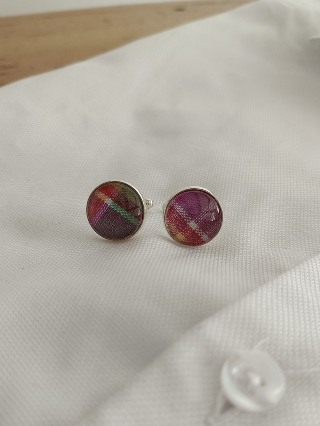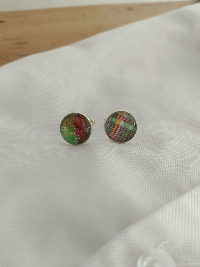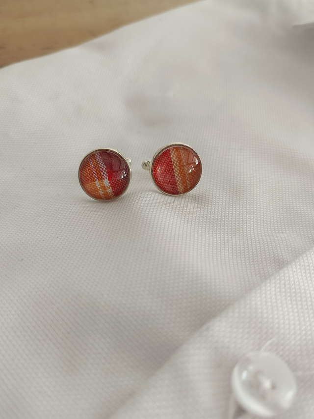 Chaque paire est unique, confectionnée à partir de tissu coloré et protégée par un cabochon de verre brillant.